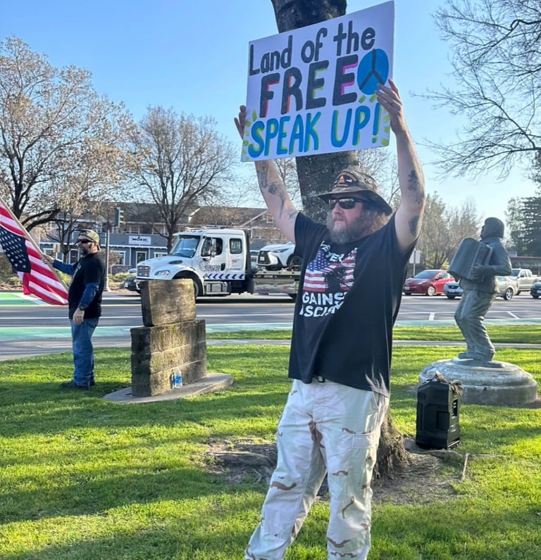 People holding handmade signs at a peaceful anti-fascist demonstration under a bright sky.